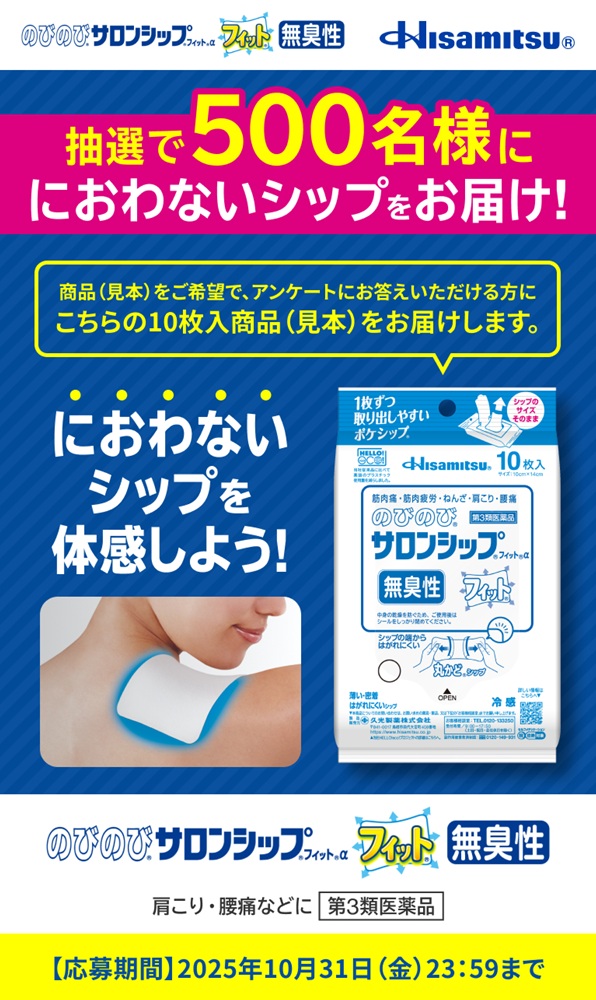 のびのび®サロンシップ無臭性R フィット®α(無臭性)におわないシップを体感しよう! 無臭性体感企画の応募受付は終了いたしました。 たくさんのご応募ありがとうございました。 無臭性体感企画事務局 hisamitsu-nobisalo-cp@precam.com 開設期間:2025年9月30日(火)~2025年11月28日(金) 受付時間:10:00~17:00 (土・日・祝は除きます)