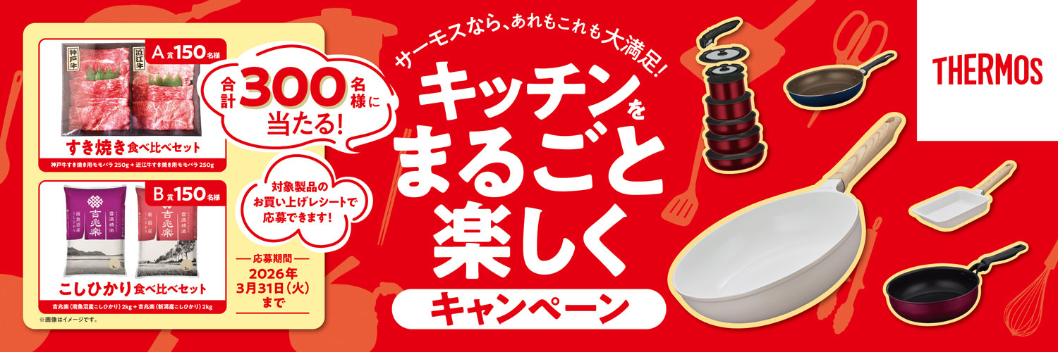 ■応募期間 2026年2月15日~3月31日 ■当選発表 ・厳正なる抽選の上、賞品の発送をもって発表にかえさせていただきます。 ・第1希望にはずれた場合も、抽選で他の賞品に当選することがあります。 ・賞品は4月上旬以降順次発送予定。 ・ご応募いただいた内容が本キャンペーンの応募条件を満たさない場合は、無効とさせていただきます。 ■対象製品 フライパン・鍋・真空保温調理器シャトルシェフ・包丁・キッチンツール・保存容器 ※キャンペーン期間中にお買い上げいただいた製品に限らせていただきます。 ※1回のご購入(1枚のレシート)で税込1,000円以上 / 製品合算可 *お⼀⼈様何回でもご応募いただけますが、1回のご応募で1⼝までとさせていただきます。 【注意事項】 ※賞品受け取りについて以下の場合、当選者様への再配達は不可になります。 ・住所不備や当選者様と連絡が取れずお渡しができなかった場合。 ・配送業者での保管期間が過ぎてしまい発送元に戻って来てしまった場合。 ※必要事項に不備や虚偽があるご応募は、無効となります。 ※販売店、業者等による申請、および代行申請は無効となります。 ※サーモス社員とその家族、および関係者の応募はできません。 ※ご応募は国内に在住でかつ連絡先が日本国内の方に限らせていただきます。 ※予告なくキャンペーン内容や商品仕様は変更になる場合はございます。 ※ご応募いただいた内容の変更はできません。 ※本キャンペーンで当選した賞品の第三者への転売、譲渡は固く禁じます。 ※抽選結果に関するお問い合わせには一切お答えいたしかねますのでご了承ください。 |
