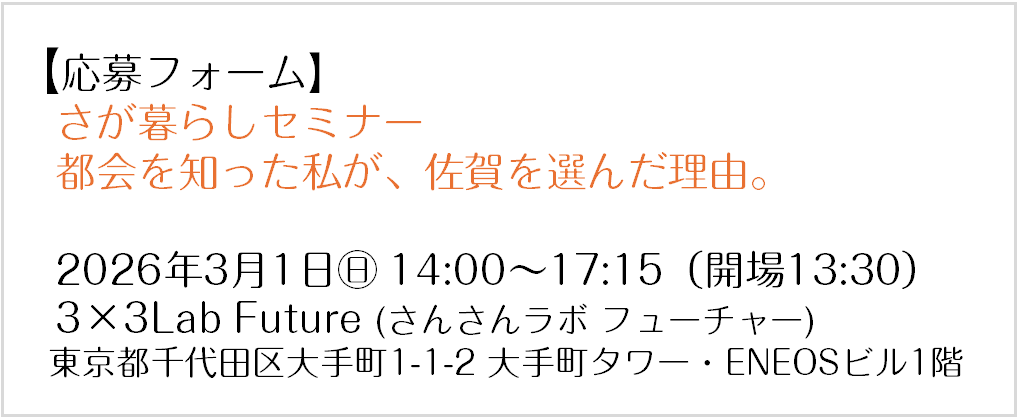 本セミナーを通じてご提出いただきました個人情報は主催者(佐賀県)に帰属し、主催者または委託先機関において厳重に管理・運営いたします。 個人情報は、セミナーに関するご案内・ご連絡、セミナーの参加登録、主催者からの情報提供のために利用し、目的外の利用はいたしません。 個人情報については、